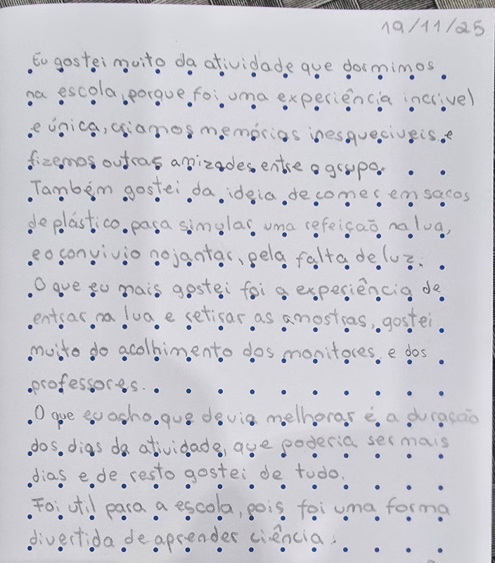 “Achei a atividade muito gira! Aprendi mais coisas sobre a Lua. Gostei muito das pessoas e gostaria de fazer mais atividades deste género."